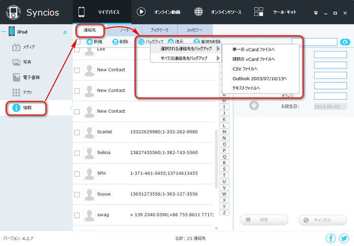 Tips:大事な連絡先を間違えて消さないように、重複する連絡先を削除する前に、すべての連絡先を事前前バックアップするのをお勧めします。Syncios 管理は重複する連絡先を削除できるソフトではなく、連絡先バッグアップと復元機能もあります。念のために、削除前に iPhone の連絡先をバッグアップしてください。