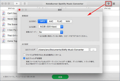 音楽の追加が完了した後、NoteBurner の右上にある歯車のようなアイコンをクリックし、設定ウィンドウを開きます。出力形式には、MP3、AAC、WAV、FLAC などが用意されています。一つの出力形式を選択します。出力フォルダを指定してから、設定ウィンドウを閉じます。変換スピードを1倍から5倍まで設定することもサポートします。