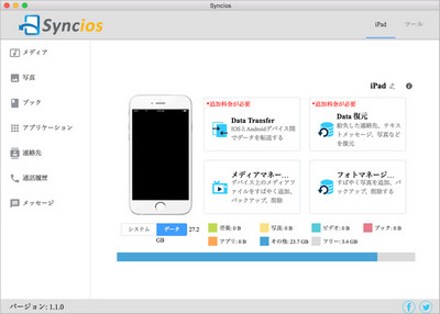 Mac Syncios 音楽転送とは、Mac 用の iOS データ転送フリーソフトです。これ一本を使えば、iPhone、iPad、iPod Touch と Mac 間での音楽、ビデオ、電子書籍、画像などのデータ転送が簡単にできます。ここでは、Mac Syncios 音楽転送を使って、Spotify からダウンロードした音楽を iPhone に無料で転送する手順をご案内します。
