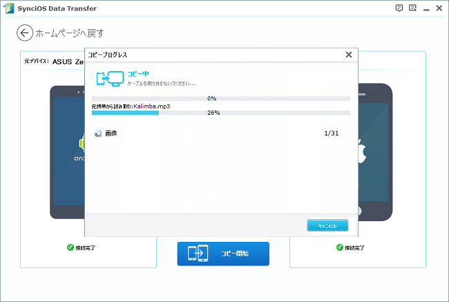 USB ケーブルでお使いの ZenFone 5 & iPhone 6 を PC に同時に接続してから、二つのデバイス間に写真と連絡先を移行するために、メイン画面の「開始」をクリックしてください。
